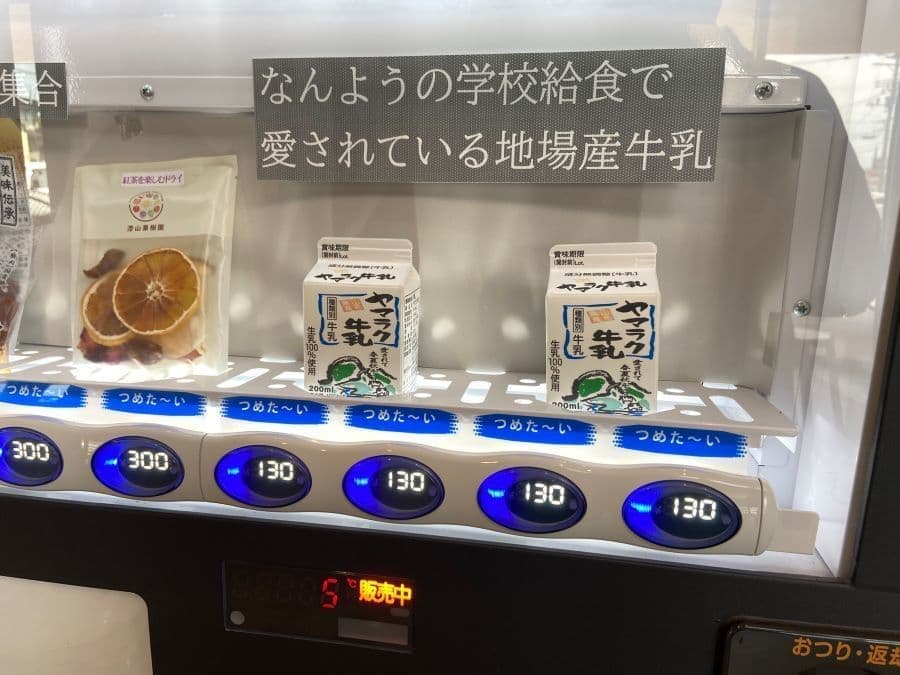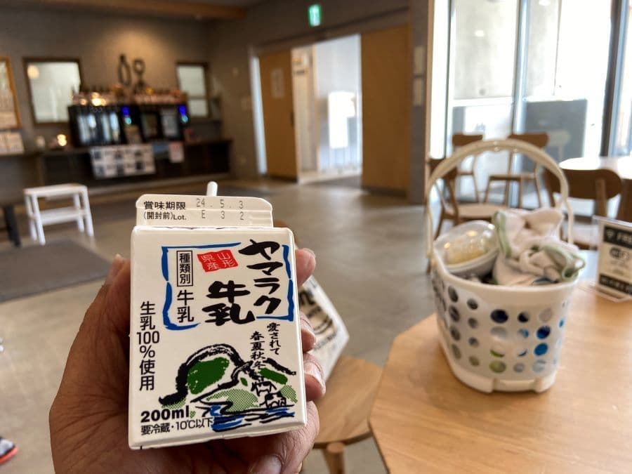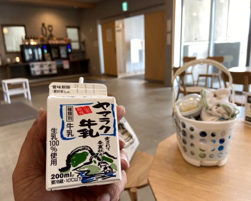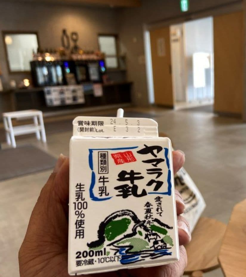 そこの自動販売機のヤマラク牛乳で、湯上りにぐいーっと。河北町の奥羽乳業さんの牛乳で南陽市の学校給食にも出されているようです。