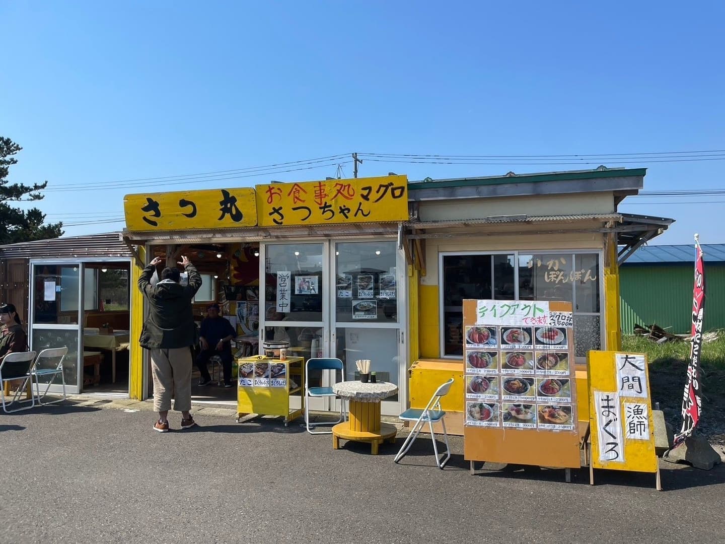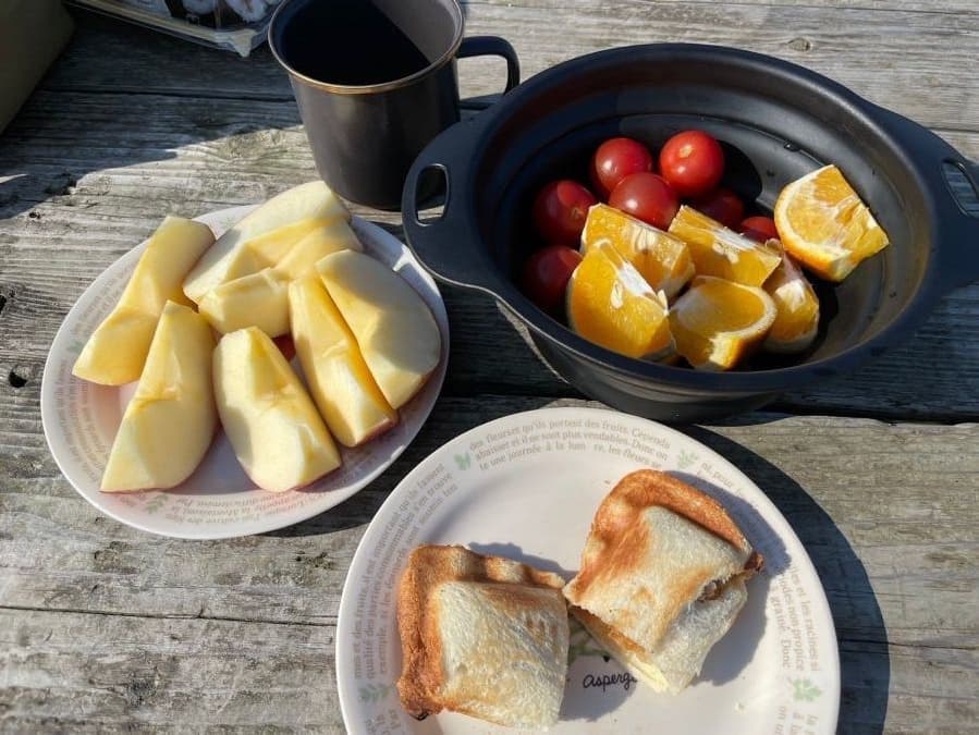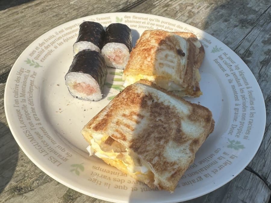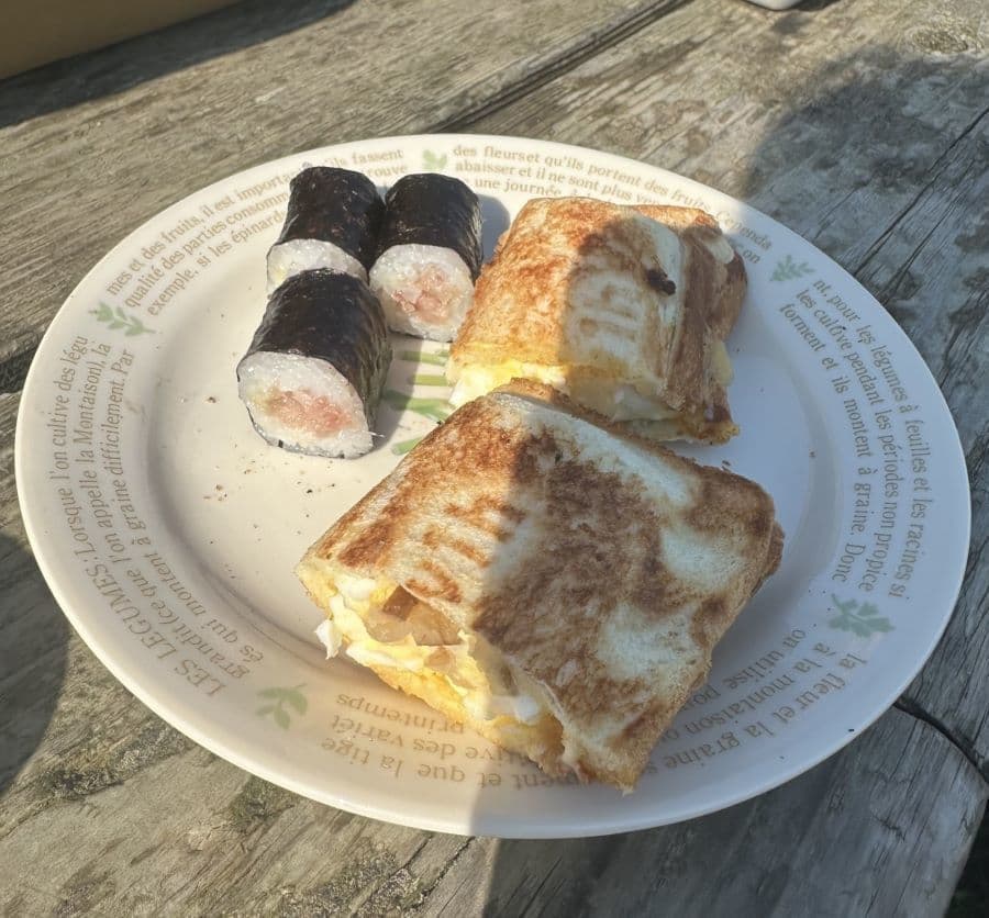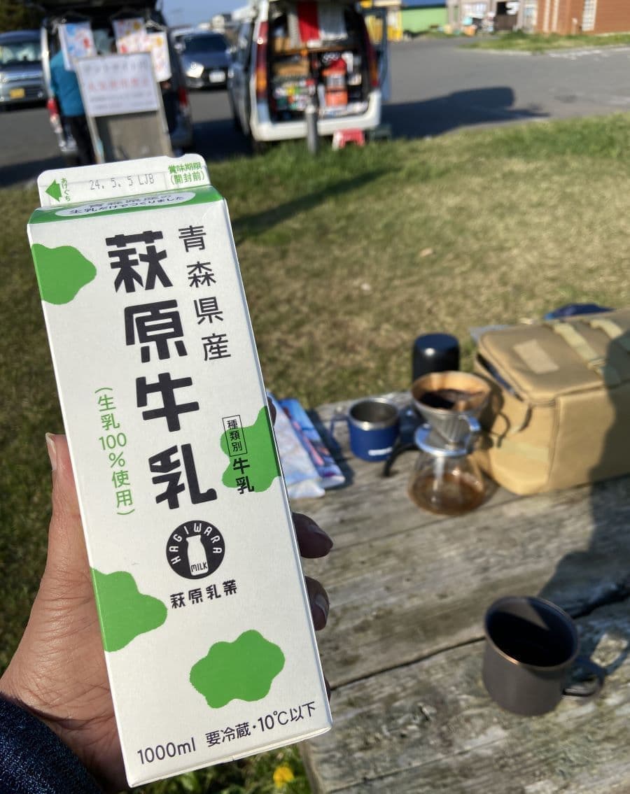 大間のキャンプ場で萩原牛乳で朝食です。同行の先輩が早朝から営業のお店で、マグロの胃袋や心臓を調達してきてくれ、これをホットサンドに。これがなかなかいけました。